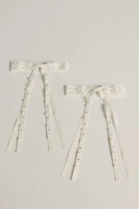 Style up your pretty tresses with this adorable hair bow set featuring two satin bows embellished with chic faux pearls and a snap clip closure. Pair with a charm necklace!