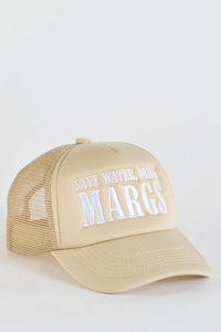 An iconic hat perf for your weekend festivities. This trucker hat features front embroidery reading, "Save Water, Drink Margs."