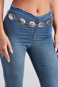 This trendy chain belt will add a boho western-chic flair to your look! It features oval-shaped accents with etched detailing and an adjustable chain with a lobster clasp closure. Style with high-rise jeans and a crop top!