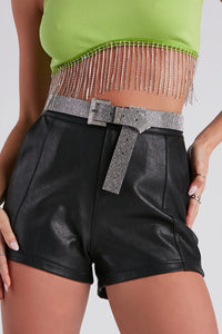 Glam up your look with this rhinestone square buckle belt! It features a black hued faux leather belt embellished with small silver rhinestones and has a rhinestone detailed square buckle. Complete the look in a rhinestone trim denim jacket for extra glitz!