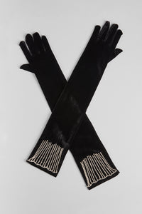Nail your glam game with luxe shine rhinestone velvet gloves. These above-the-elbow stunners with fringe rhinestone trim are perfect formal occasions.