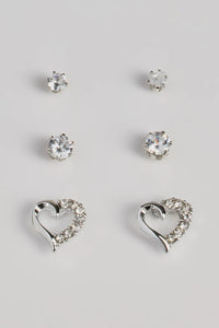 The three-pack stud earring set features two pairs of round cubic zirconia embellished studs and one pair of heart-shaped cutout studs accented with cubic zirconia stones for a dainty glam sparkle you'll love.