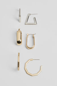 Flaunt your style with the sleek detail three-pack hoop earrings set. Featuring triangle, oval, and angled hoops, these chic pieces are perfect for any occasion.