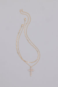 Add a touch of faith and style to any outfit with this cross chain necklace! The elegant faux pearl cross hangs delicately from layered chains, creating a timeless and meaningful accessory.