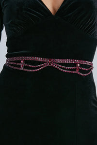This gorgeous gemstone chain belt will showcase a rare sparkle to amp up the glamour of your dressy looks. It features a four-row draped design with sparkling gemstone embellishments and larger round gemstone accents. Includes a back adjustable chain and lobster clasp closure. Layer this glitzy belt over a velvet dress styled with rhinestone heels.