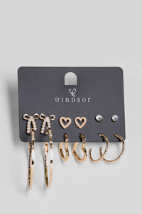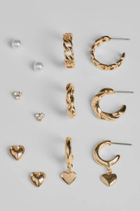 Glam up your fave 'fits with this glitzy stud and hoop earring set! It features sparkly round rhinestone studs, heart-shaped outline studs embellished with mini faux pearls, bow-shaped studs adorned with faux pearls, small heart-shaped hoops, medium textured hoops, and large hoops with mini rhinestone accents. Style with a dainty bracelet.