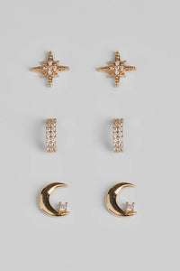Create a celestial glam style that's out of this world with these three-pack stud earrings. The set features one pair of rhinestone star stud earrings, one pair of moon rhinestone stud earrings, and one pair of rhinestone bar stud earrings. Complete the look with rings.