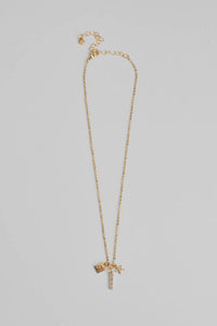The celestial charm necklace features a dainty chain accented with a lock charm with a mini rhinestone star, a rhinestone-embellished bar charm, and a rhinestone-embellished star charm for a pretty glam sparkle.