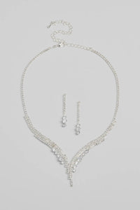 Elevate your formal wear beauty in this necklace and earrings set for a perfect look! The necklace features a decadent design glimmering with rhinestone embellishments in a V-cut design with matching dangly rhinestone earrings. Complete the look with a glamorous clutch for a special occasion!