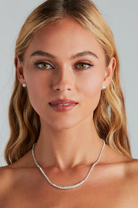 You'll be loving every moment spent in this dainty necklace and earrings set! The necklace features a mini rhinestone strand with statement rhinestones along the front and a lobster clasp closure. The matching rhinestone stud earrings feature a post-back closure. Complete the look in glam platform heels for a dressy soiree!