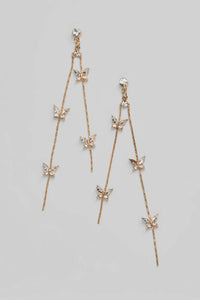 Create a statement in these elegantly whimsical earrings! Featuring a top rhinestone post with cascading dainty chain links with rhinestone embellished butterfly charms. Complete the look with a ring set for any occasion!