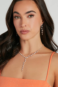 This necklace and earrings set is perfect for any occasion, emanating elegance and luxury. Featuring a lariat necklace and matching linear earrings, adorned with rhinestone embellished clusters that add a touch of glamour to your formal wear. Complete the look with a luxe clutch for a special event.