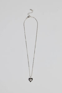 This adorable charm necklace features a dainty flat chain accented with a black heart pendant with an engraved angel detail. Layer with other necklaces styled with hoop earrings.