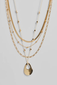 The charm necklace features a four-row design with a sleek snake chain layer, a dainty beaded chain layer, a trendy flat chain layer, and a thin cord layer accented with beading and an oval-shaped metal pendant. Style with hoop earrings.