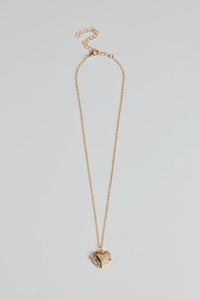Stun in a necklace that features a dainty chain and an etched heart pendant. Complete with a drop-waist dress and flat shoes.