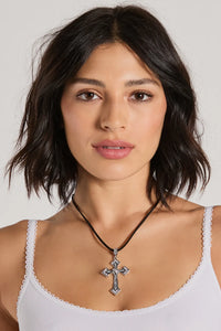 Bold Style Baroque Cross Necklace Bold Style Baroque Cross NecklaceShowcase a bold style that will be the statement piece of your 'fit with this cross necklace! Designed with a thin cord strap, it features an intricate baroque cross pendant with cutout detailing for a trendy-chic vibe. Keep the rest of your accessories simple with rhinestone stud earrings. Fit & Features - Cord strap design