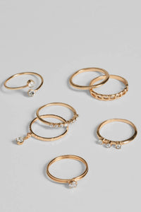 Stackable Style Seven Pack Ring Set Stackable Style Seven Pack Ring SetThe perfect seven-pack ring set to achieve stackable style! This set features an assortment of various designs and styles with glitzy rhinestone embellishments that bring some sparkle to your look. Complete the look with a chic handbag for any occasion! Fit & Features - Seven-pack ring set