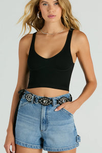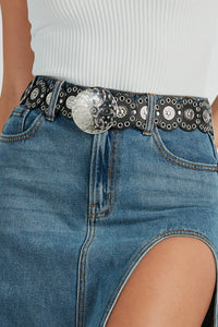 Ride Along Medallion Western Faux Leather Belt Ride Along Medallion Western Faux Leather BeltA stylish western belt to adorn your outfit for festivals, concerts, or bachelorettes! Featuring a bold circular design and metal grommet accents, a statement medallion buckle with a hook clasp adds a touch of flair. Complete the look in a trending denim maxi skirt and cowboy boots! Fit & Features - Faux leather material