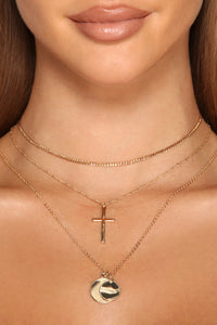 Cross Cham And Coins Necklace Cross Cham And Coins NecklaceLayer on the style with a necklace that radiates glamour! The necklace features a dainty chain link design, a flat cross charm, and a coin charm. Complete look with a graphic tee and cutoff shorts. Fit & Features - Includes one necklace