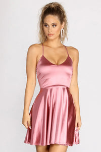 Have a twirl-worthy moment in this gorgeous and glam satin skater dress. It features a sleeveless square neckline, adjustable spaghetti straps that lead to a cross-back and lace-up back design, a fitted bodice with a high waist, and a flirty skater silhouette. Style this dress with rhinestone earrings and new heels.