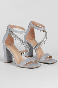 Have a moment of luxe with these gorgeous embellished block heels. They feature an open square-shaped toe with a strap, an asymmetric strap across the foot with a glam chunky rhinestone fringe design, an ankle strap, a closed back with a zipper closure, and a block heel. The black heels are faux nubuck and the silver heels are woven glitter. Style with a sparkly clutch.