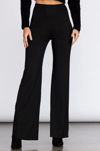 Chic yet also casual, these basic stretch pants can be dressed up or down! They feature a high rise waist paired with wide pant legs. The bottoms are composed of a stretchy knit fabric, offering a form-hugging fit that flows down.