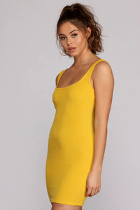 Brighten up the day in this mini dress! It features a sleeveless bodice, tank-like shoulder straps, a square neck and back, and a short, form hugging fit. The dress is composed of a soft knit fabric that offers plenty of stretch.