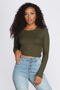 You're so beautiful, you only need a basic piece! This crop top features a crew neckline, long fitted sleeves, and a merrow edge trim. The top is composed of a ribbed knit fabric with plenty of stretch.Style Number/Barcode: 06002-0256