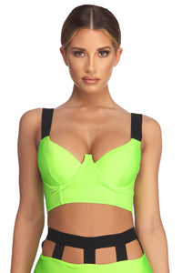 You're too bad for a typical bikini! Your styles calls for this neon green swim top with padded V wire cups and contrast black shoulder straps. Don't forget the matching caged swim bottom!Model is 5'6" with a 34" bust, 24" waist and 37" hips. She is wearing a size small.