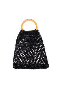 This boho chic netted tote is totes perfect for beachin' it! It features a curved wooden handle and a black hued netted pouch.