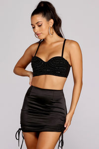 Easy on the embellishment? Nah, so not you! Glam it up in this gorgeous beaded bustier. The bustier features a sleeveless sweetheart neckline, padded cups, and removable adjustable spaghetti straps. The bodice features rhinestone with gemstone embellishments and an embroidered floral design. Complete look with a faux leather wrap skirt.