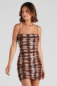 This adorable mini dress will be a new trendy fave! It features a sleeveless square neckline, bungee spaghetti straps, ruching down the side seams, and a short, curve-hugging, bodycon silhouette. The lined mesh fabric features an all-over tie-dye print pattern. Complete the look with clear mules.