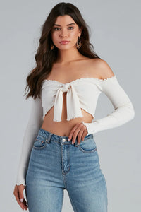 Get a trendy look for the season with this adorable crop top. Featuring an off-the-shoulder sweetheart neckline, long fitted sleeves, a tie-front detail, and a cropped, form-hugging fit, this top is perf for every day. Style with high waist jeans and mules.