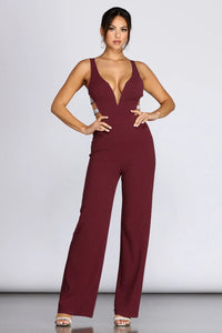 Add a touch of shine to your look! This jumpsuit features a wired plunging V neckline, and a sleeveless bodice with tank straps that lead to a low square back with a zipper closure. Sides of bodice feature a three bar rhinestone cut out detail, everything we love about this look! Bodice meets pant legs high waist with a band detail, and flare into a wide leg hem.