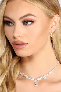 Add a touch of glamour to your gorgeous look with this necklace and earring set! It features a necklace with an intricate rhinestone design and a teardrop shaped lariat, as well as matching rhinestone duster earrings. Pair this stunning set with a floor-sweeping formal dress.