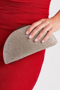 Add a touch of glitz and glam to your formal 'fit with this sparkling rhinestone mesh clutch! It features a half-moon shape, a sleek metal trim with a top clasp closure, a rhinestone mesh exterior, a smooth satin woven interior, and an included chain-link shoulder strap. Style with a floor-length satin dress and stiletto heels.