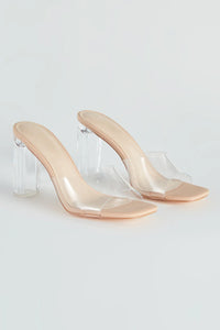 Add a touch of chic to your everyday looks with these of-the-moment clear-heel mules. They feature an open square-shaped toe, a wide clear strap across the foot, an open back for easy on-and-off styling, and a clear lucite block heel. Style with a fitted bodysuit and tie-waist pants.