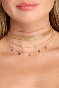 Add a touch of gold glam to your look with these trendy and chic chokers! The set includes four necklaces, one a basic chain link, one a thick metal mesh choker, one a dainty chain, and one adorned with star charms. Each includes an adjustable lobster clasp closure.