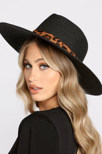 Bring a fun element to your summer look with a touch of leopard! Style this dark yet summer-y hat with a flowing bell sleeve romper, or a black summer mini dress!