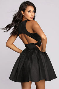 Special OccasionOur beautiful taffeta sleeveless Abbi dress brings us back to vintage-inspired style! She features a round neckline, padded cups, a cut out at the Back as well as two zippers. One at the upper and one the lower back. Abbi is a perfect party length and has pockets! She has a lining with a tutu underneath, this gives the dress an elegant poof. One is never under dressed in a little black dress!