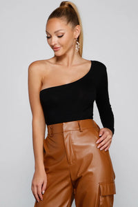 Showcase a trendy vibe with this chic one-shoulder bodysuit. It features a single long fitted sleeve, a thong bottom with a dual snap button closure, and a form-hugging fit. Style this bodysuit with faux leather pants and clear mules.