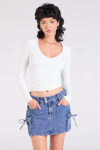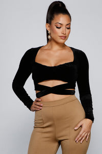 Showcase a trendy look perf for every day with this velvet crop top. It features a sweetheart neckline with a ruched bust, a front waist cut out with a tie-front detail, long fitted sleeves, and a cropped, form-hugging fit. Style this top with high-rise jeans.