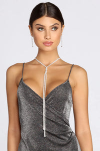 This luxe lariat necklace and earrings set will add a twist of glam to your look. It features a cascading double-row rhinestone necklace and matching earrings. The long lariat necklace features rhinestones from edge to edge, a center twisted design, and is perfect to accentuate plunging necklines. You'll definitely bring the drama to your next fancy date night! Pair with a bodycon dress and sleek heels.