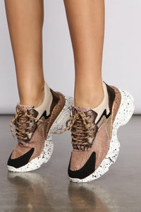 Have a major trendy moment in these cute chunky sneakers! They feature a lace-up front, a textured chunky sole, gold mesh material, and speckled detailing allover the sole. Pair these sneakers with some comfy biker shorts and an oversized graphic tee for an elevated everyday 'fit.