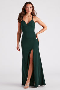 Give everyone something to talk about in the sultry Aaliyah formal crepe dress perfect for wedding guests or homecoming! She features a sleeveless V-neck, a padded bust, a lace-up back design, and a flattering mermaid silhouette with a sexy high-cut front slit along the floor-length hem. The formal dress is composed of a lined crepe fabric with a moderate stretch. Complete the look in a glamorous necklace and earrings set.