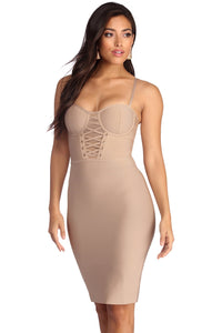 Let your dress do the talking! This taupe bandage dress features a bustier style bodice with a sweetheart neckline, underwire and padded cups, lattice straps details, adjustable shoulder straps, and a hidden back zipper closure. Midi dress has a body-hugging fit and is composed of a thick, bandage fabric with a moderate stretch.Model is 5'7 with a 34" bust, 24" waist, and 36" hips. She is wearing a size small.