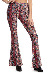 Bring plenty of flair with these far out pants that let your free spirit shine through! They feature a high rise waist, a straight leg fit with a flared hem and an all over bohemian inspired print that includes mauve, purple and blue hues. Pants are composed of a smooth knit fabric that offers a form hugging fit with a moderate stretch.