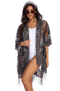 Let your boho side show in this pretty kimono! It features a drape open front, kimono sleeves, an all over paisley burnout print and a fringe trim throughout. Kimono is composed of a lightweight woven fabric that offers a relaxed fit with a minimal stretch.
