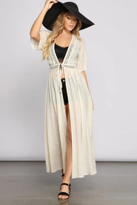 Channel those boho vibes with a duster that is perf to layer over your festival outfits or over your swimsuit! The duster features V-neckline, cute tie-front ties, an embroidered trim, short kimono sleeves, and a flowy long length. Complete look with a floppy hat and sunnies.