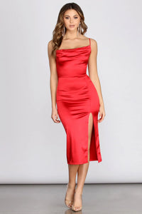 Adalee Formal High Slit Satin Dress Adalee Formal High Slit Satin DressSpecial Occasion Keep it simply stunning in satin as you make your entrance in our Adalee dress! Her high slit brings an extra dramatic detail! Fit & Features - Cowl Neckline